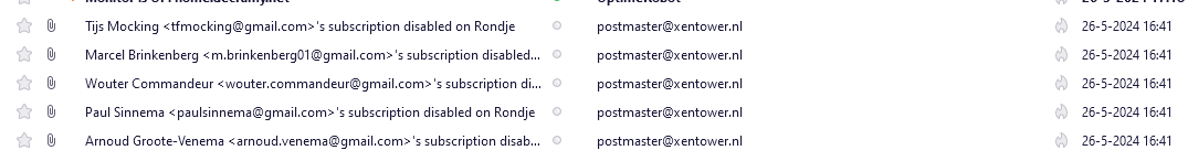 Op dit moment staan de volgende mensen op de lijst (21 stuks): arnoud.venema@gmail.com ben@mesman.eu casper@eyckelhof.nl decramy@decramy.net erwin@snt.utwente.nl h.gijlers@home.nl jjfverweij@hotmail.com jorik@kippendief.biz lukas@loekalive.net m.brinkenberg01@gmail.com martin@grachtwal.nu matthijs@bomhoff.nl matthijs@vanpolen.biz mhraad@hotmail.com paulsinnema@gmail.com r.dahmen@me.com soretha@me.com teun@snt.utwente.nl tfmocking@gmail.com wieger@opmeer.net wouter.commandeur@gmail.com
